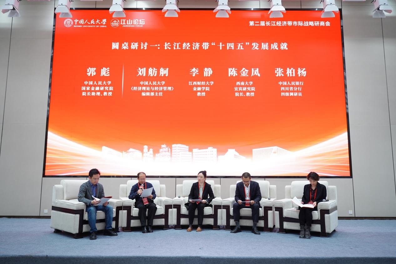 在论坛第二阶段,西南大学宜宾研究院院长陈金凤教授、江西财经大学金融学院教授李静、中国人民大学《经济理论与经济管理》编辑部主任刘舫舸、中国人民银行四川省分行四级调研员张柏杨共同参与“长江经济带‘十四五’发展成就”主题圆桌研讨。该环节由中国人民大学国家金融研究院院长助理郭彪教授主持。