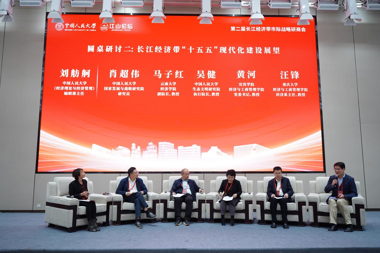 中国人民大学生态文明研究院执行院长吴健教授、宜宾学院经济与工商管理学院党委书记黄河教授、云南大学经济学院副院长马子红教授、重庆大学经济与工商管理学院经济系主任汪锋教授、中国人民大学国家发展与战略研究院研究员肖超伟,共同参与“长江经济带‘十五五’现代化建设展望”主题圆桌研讨。该环节由中国人民大学《经济理论与经济管理》编辑部主任刘舫舸主持。